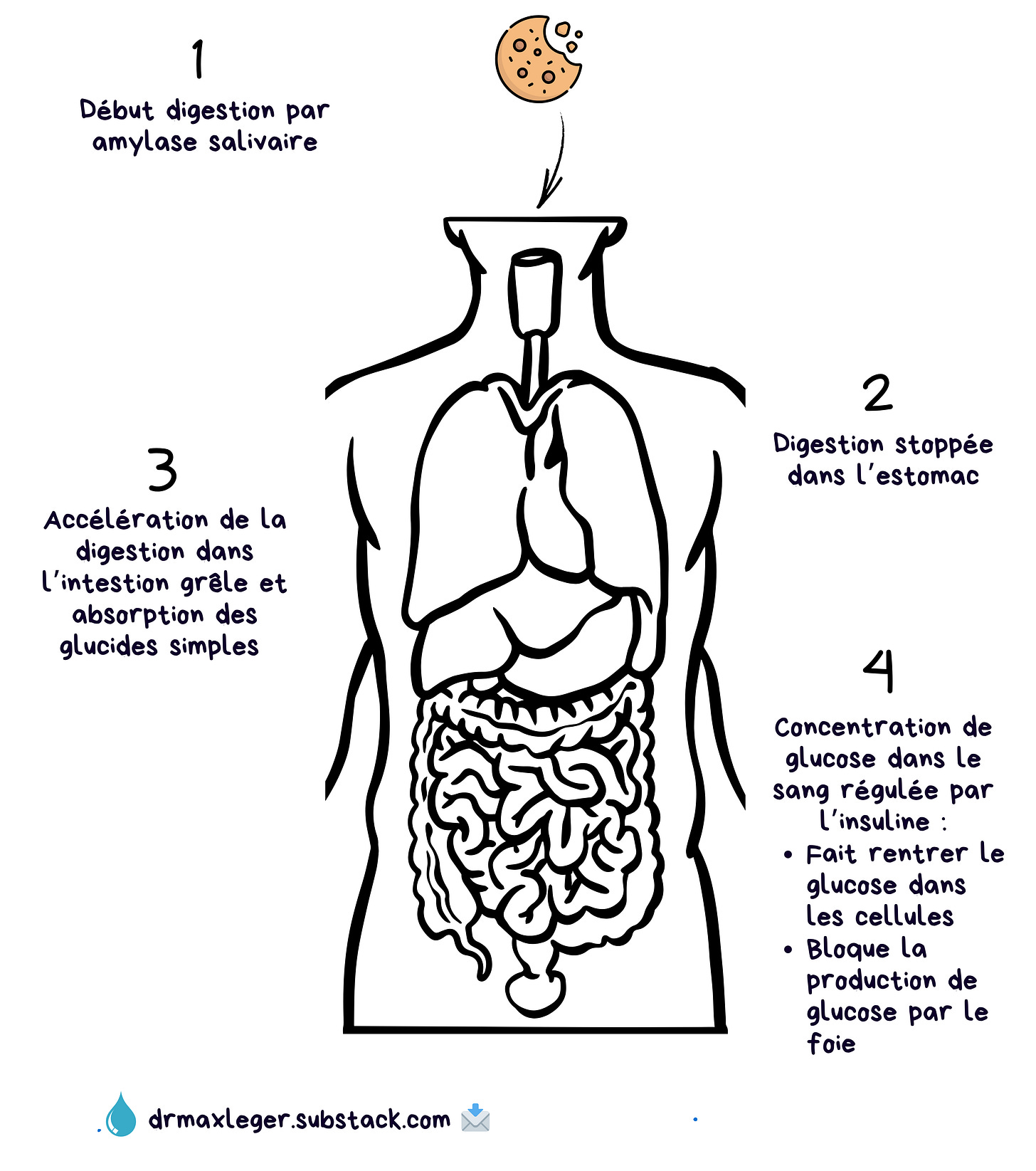 Pour mieux comprendre aussi quel est l’impact des glucides, voici le parcours métabolique typique d’un aliment riche en glucides :